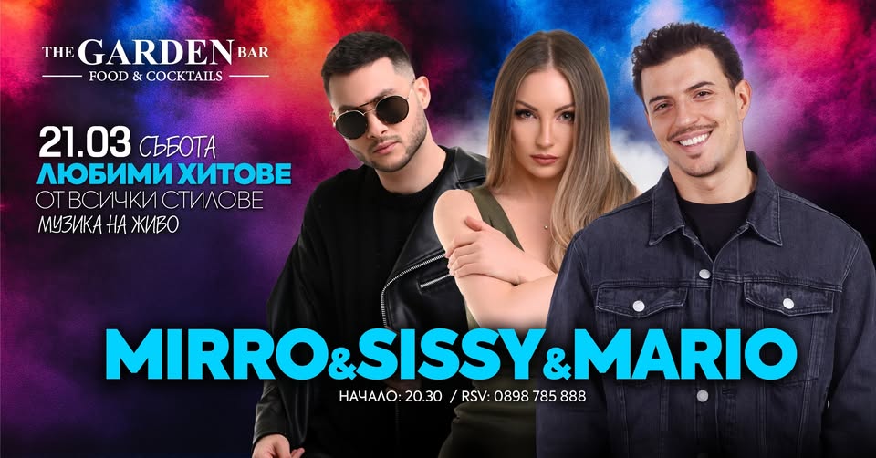 21.03 /събота/- Очаква ви страхотно парти с музика на живо от всички стилове и за всички вкусове. На сцената ще бъдат отново талантливите свежари МИРО & СИСИ и МАРИО /които взривиха нашата сцена на 14.02/ Пожелахте да бъдат наши гости отново и изпълняваме вашето желание - 21-ви март /събота/ - запазете от сега вашите места. А за всички, които все още не са ги гледали - ще се влюбите в тяхната ене